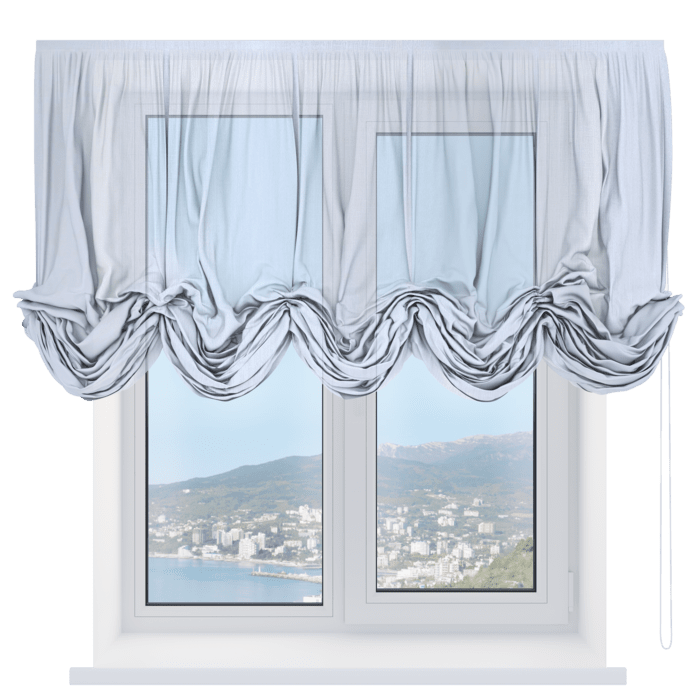 Австрийская штора лён кашемир голубой, карниз верёвочный