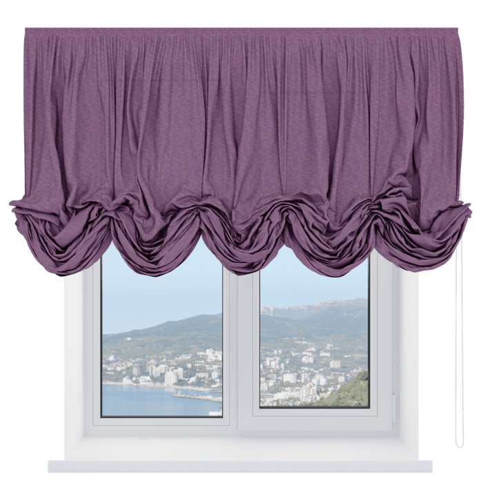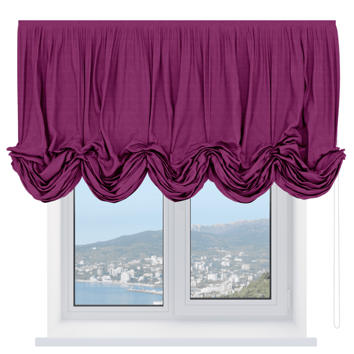 Австрийская штора вельвет тёмно-фиолетовый, карниз верёвочный